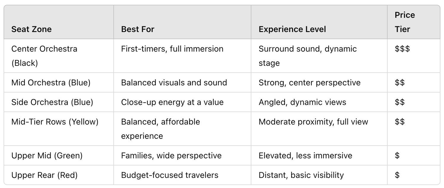 These center orchestra seats put you directly in front of the rotating stage. You’ll have a clear line of sight to every vertical lift, aerial maneuver, and fire effect. The surround sound and theatrical effects are also best experienced here.