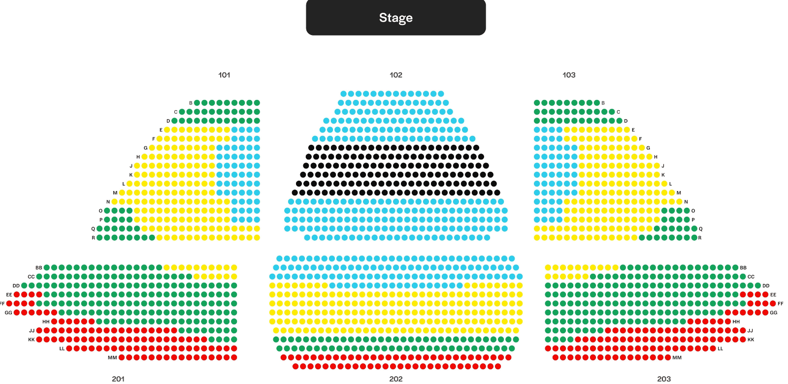 Black zone = Premium seats (center, immersive, closest to stage)