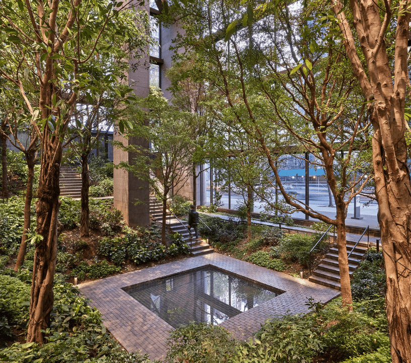 Inside the IBM Building at 590 Madison Avenue, a bamboo garden and waterfall create a peaceful atmosphere in the public atrium. The space connects via glass-enclosed walkway to Trump Tower's public garden, forming part of a network of indoor spaces perfect for wet-weather exploration.