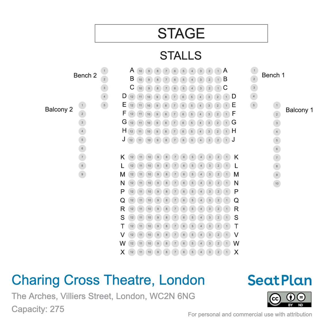 Getting There: Charing Cross Theatre is at The Arches, Villiers Street, London WC2N 6NL. Charing Cross tube (Northern and Bakerloo lines) and Embankment tube (Northern, Bakerloo, District and Circle lines) are both 2 minutes' walk. Charing Cross mainline station is directly above the venue.
